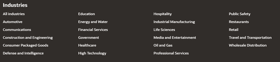 Oracle has a very broad and deep Cloud Application offering – from ERP, Supply Chain and Manufacturing to HCM and Customer experience. A short list is below.